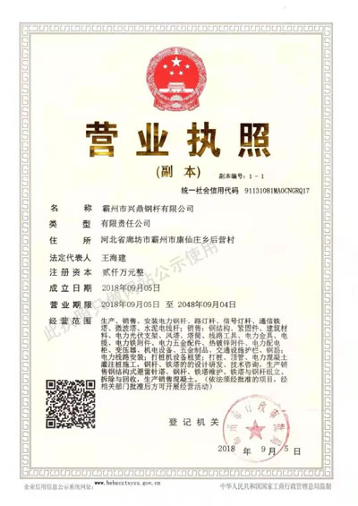霸州市兴鼎电力钢杆有限公司是集科研开发、生产制造、安装施工为一体的现代化生产企业,坐落于河北省霸州市工业园区,地理位置优越,地处京津保三角地带核心,交通便利。本公司有着20余年的生产销售经验,主要产品:10千伏,35千伏,66千伏,110千伏220千伏电力钢杆、钢管杆、输电钢管塔、钢杆基础、钢杆基础打桩等。