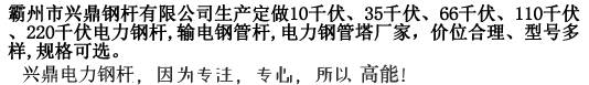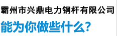 霸州市兴鼎电力钢杆有限公司是集科研开发、生产制造、安装施工为一体的现代化生产企业,坐落于河北省霸州市工业园区,地理位置优越,地处京津保三角地带核心,交通便利。本公司有着20余年的生产销售经验,主要产品:10千伏,35千伏,66千伏,110千伏220千伏电力钢杆、钢管杆、输电钢管塔、钢杆基础、钢杆基础打桩等。